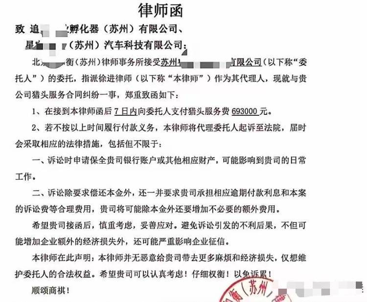 一张讼师函截图清楚,追觅创业孵化器 (苏州) 有限公司和星宸将来(苏州)汽车科技有限公司(以下简称“追觅创业孵化器”和“星宸将来”)被条目在7日内,向拜托东说念主苏州睿知念念格究诘有限公司(以下简称“睿知念念格”)支付猎头就业费69.3万元,若未施行付款义务,将告状至法院。