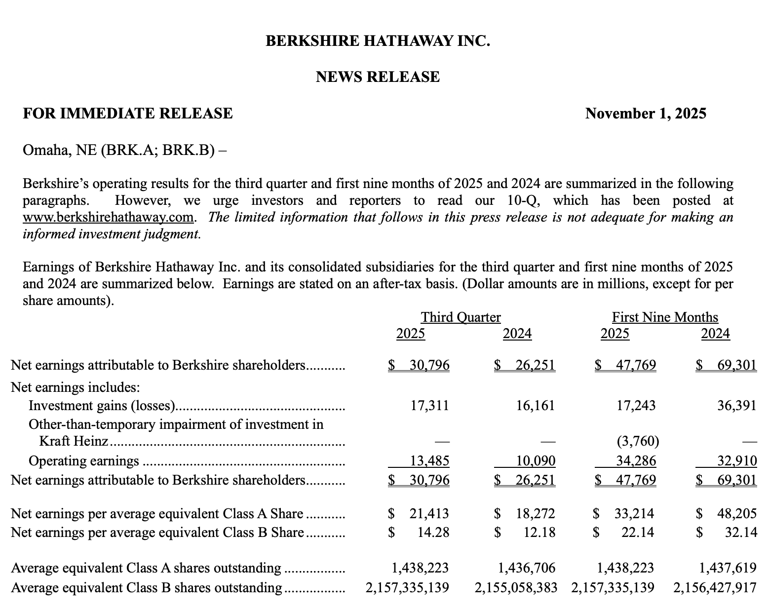 伯克希尔哈撒韦A:Q3净利润307.96亿好意思元伯克希尔哈撒韦A:Q3净利润307.96亿好意思元